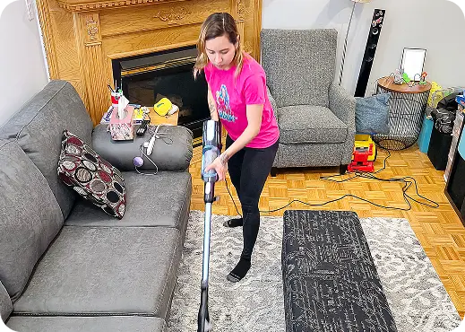 House cleaner cleaning the living room during a residential cleaning service.